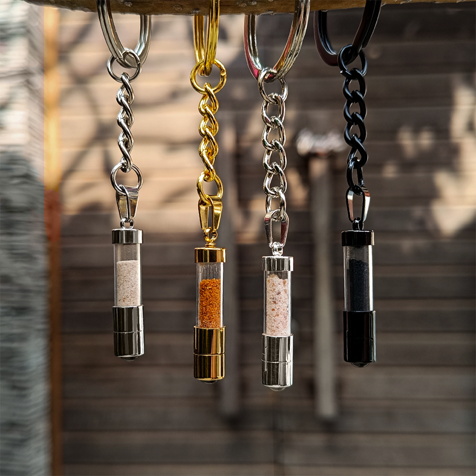 Our Amore Memento Keychain will carry a photo of your favorite memory AND you can put anything of sentimental value inside of the capsule e.g. Sand, Ashes, Earth, or Fur etc.